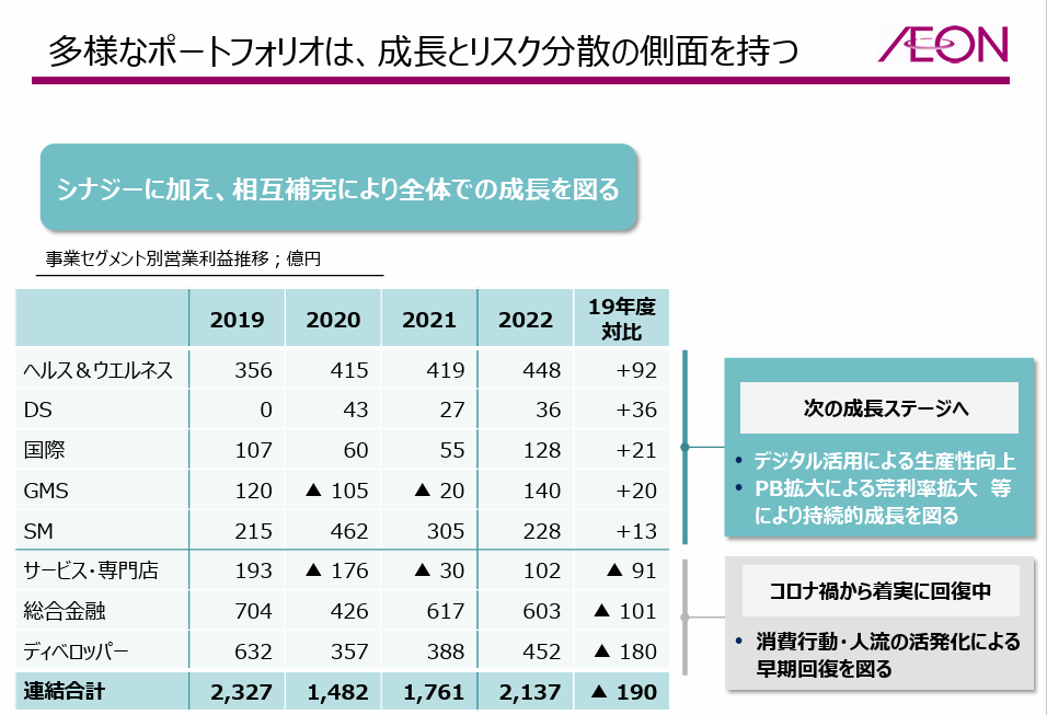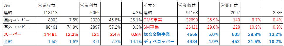 表:7&iとイオンの部門ごと収益の比較(各社2022年決算より)