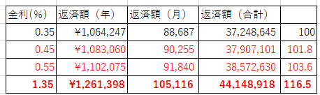 これらは当然いきなり短期金利を上げるという事ではないと思いますが、それでも今後0.1%等少しずつ上げるのではなく1〜2年で1%上げるという可能性はあり得ると見ておくとよいかもしれません。上は令和の大きな宿題その27 マイナス金利緩和が攻める選択肢〜皆を取るか、余裕ある住宅ローン保有者を取るか〜と言う記事で作った住宅ローンの表に金利が1%上がった1.35%を追加したものですが、さすがに1%上がると大きいです。3500万円のローンで月額で1.6万円、年間で20万円ほど、増加率は16%程となります。