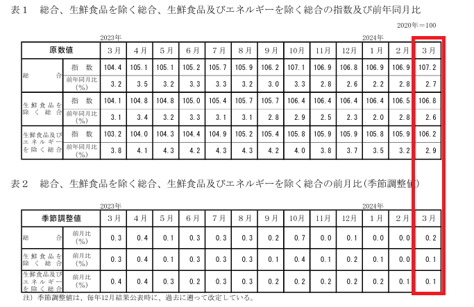 2020年基準消費者物価指数全国 2024年(令和6年)3月分@総務省統計局