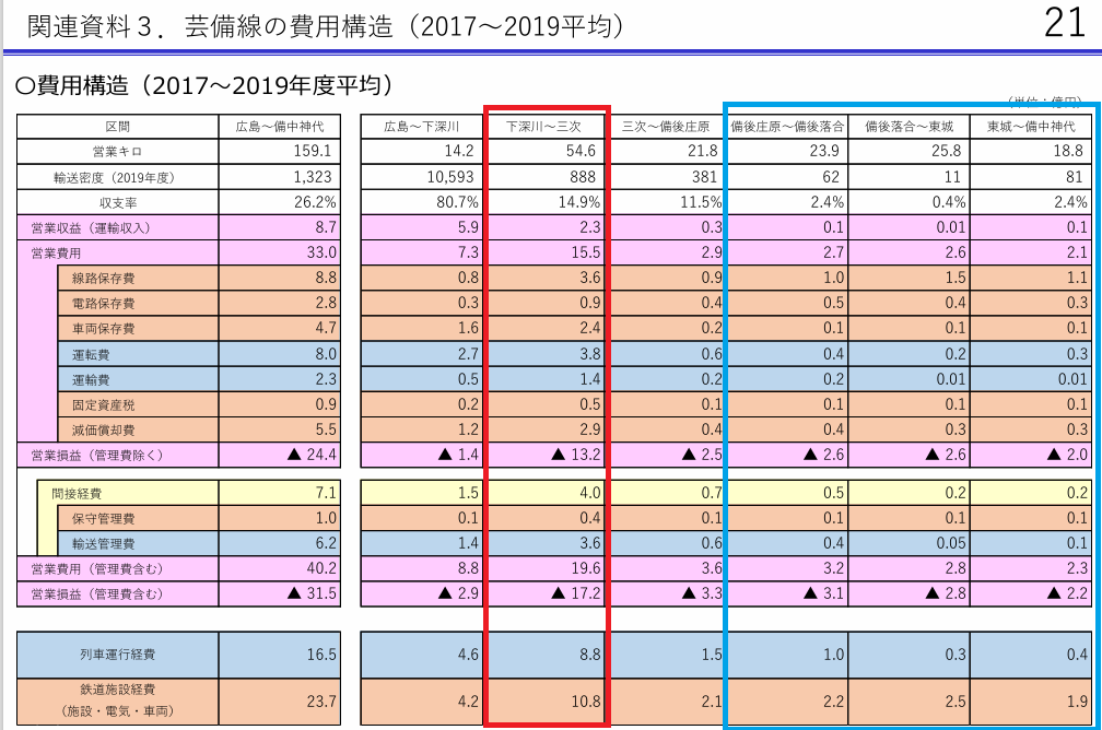 さて、まず芸備線の経営状況を見ていきます。今回協議会で対象となり営業係数の悪い路線として有名になった備後庄原~備中神代ですが、実は赤字額は各区間3.1億円以下とそう大きくないのが分かります。むしろ下深川〜三次の赤字額が17.1億円と路線全体の赤字額の過半を占めています。言うなれば備後庄原~備中神代は運行経費を抑える事で赤字を最小限にとどめていると言えます。