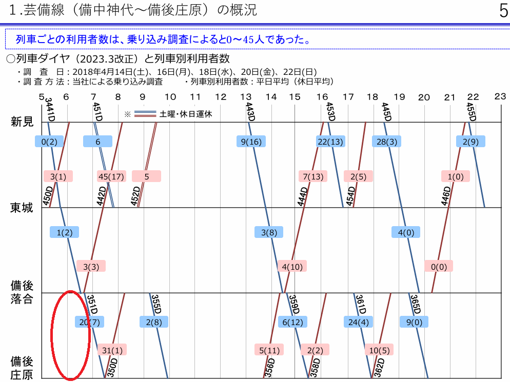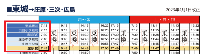高校があり、人口も多い備後庄原・備後西城・東城・新見各駅間の通学時間帯の時刻を調べると、備後庄原〜備後西城、東城〜新見間は比較的良い時間帯に列車があるのですが、新見・東城→備後西城・備後庄原は5時台発と時間が早すぎ、備後庄原・備後西城→東城・新見は通学に適切な列車がない事が見て取れます。纏めると備後庄原、備後西城地区から東城高校及び新見市内への学校へは現状通学に使える公共交通が確保できていないと言えます。