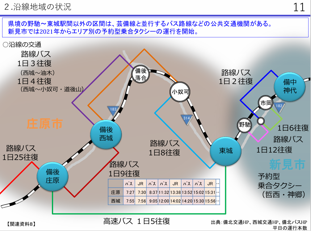並行して便利なバス路線があるのではと感じる方もいるかもしれません。実際資料でも並行のバス路線に関する記載もあります。ただ庄原市内で言えば実際に通学に使える路線は資料に時刻が掲載されている庄原〜西城間の路線と、高速バスのうち東城→庄原の片道位です。他は調べて見た限りでは通学に適した時間帯の運行は確認できませんでした。また並行バス路線のある庄原〜西城に関しては鉄道利用も一定数いるのも確かです。