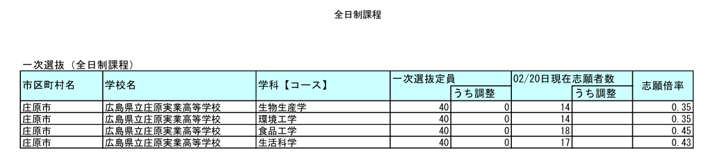 広島県立庄原実業高等学校2024年一次選抜の志願状況より