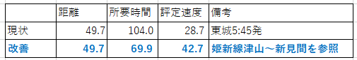芸備線徐行解除後の所要時間想定(姫新線津山〜新見間の評定速度を参照)