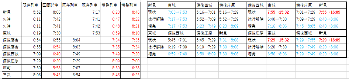 という事で改善策を考えていきます。まずは増発となります。上の図で赤丸がついている部分、現状備後落合発6:41の新見行きの列車を備後庄原発にすれば現状備後庄原・備後西城から東城・新見地区の高校への通学が可能となり、かつ新見着8:08、東城7:31着と時間帯も悪くないです。また現状備後西城7:01、備後庄原7:29着となっている列車は三次市内の高校への通学を意識した為か庄原市内への到着が早くなっていますがこの列車の3〜40分後に到着する列車があるとより通学利用を促進する事が可能となると思われます。