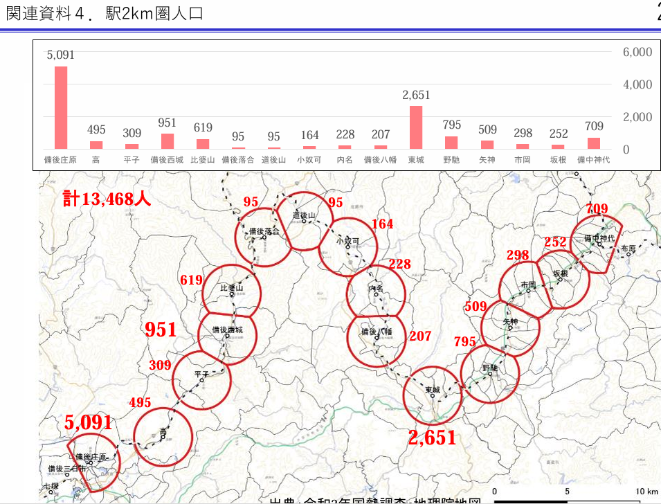 芸備線各駅半径2kmの人口@芸備線再構築協議会の協議体制について@中国運輸局2024年3月26日より
