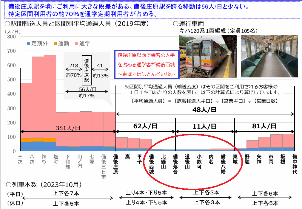 そしてこの区間の利用者を見ると、おかしな事に気付きます。輸送密度11人と非常に利用の少ない備後落合〜東城間を含む備後西城〜東城間の通学定期利用者が殆どいない事です。俗に人口の少ない地域での旅客鉄道利用者で大きな割合を示すのは高校生の通学と言われ、周辺の備後庄原〜備後西城、野馳〜備中神代に関しては通学定期利用者が利用の大半を占めている事を考えるとそのおかしさに気付かれる方もいると思います。