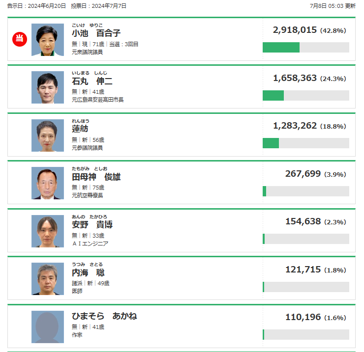 都知事選 現職の小池氏が3回目の当選 石丸氏 蓮舫氏らを抑える@2024/7/8NHKより