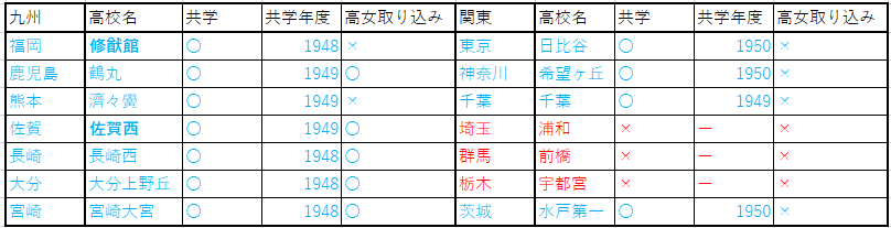 旧制一中に関しては地域によって男女共学化、別学は地域によって分かれます。関東地方1都6県と九州島内7県の旧制一中の共学に関する状況を比較すると上の表の様になります。驚くことに九州の旧制一中がすべて共学なのに対し都会の関東では埼玉・群馬・栃木の3県が男女別学になっているのが見て取れます。