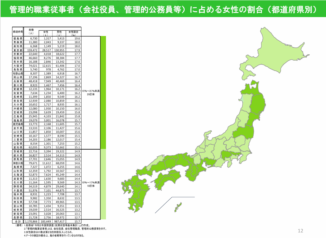 管理的職業従事者(会社役員、管理的公務員等)に占める女性の割合(都道府県別)@内閣府男女共同参画局より
