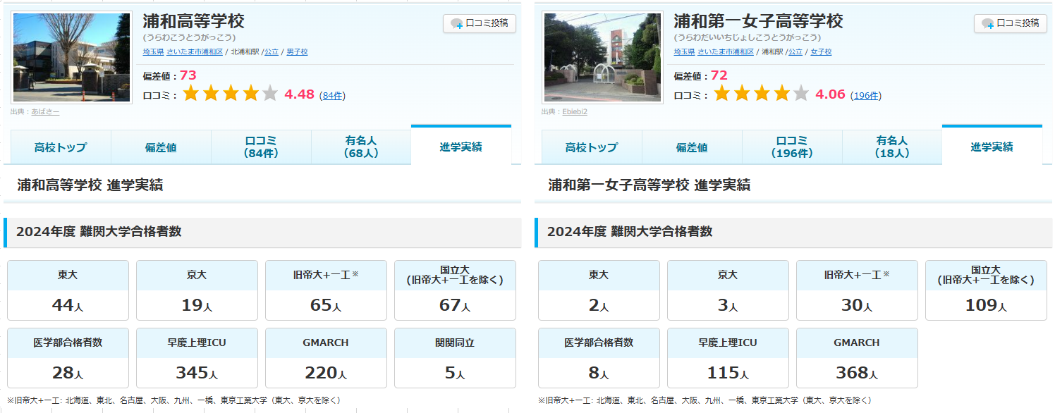 旧制一中(浦和高校)と旧制一高女(浦和第一女子高校)との進学実績比較