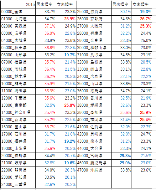表2:2015年の30代後半男女の未婚率(国勢調査より作成)