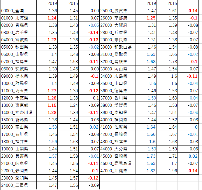 表1:各都道府県の2015→2019年の出生率変化(e-Statより作成)