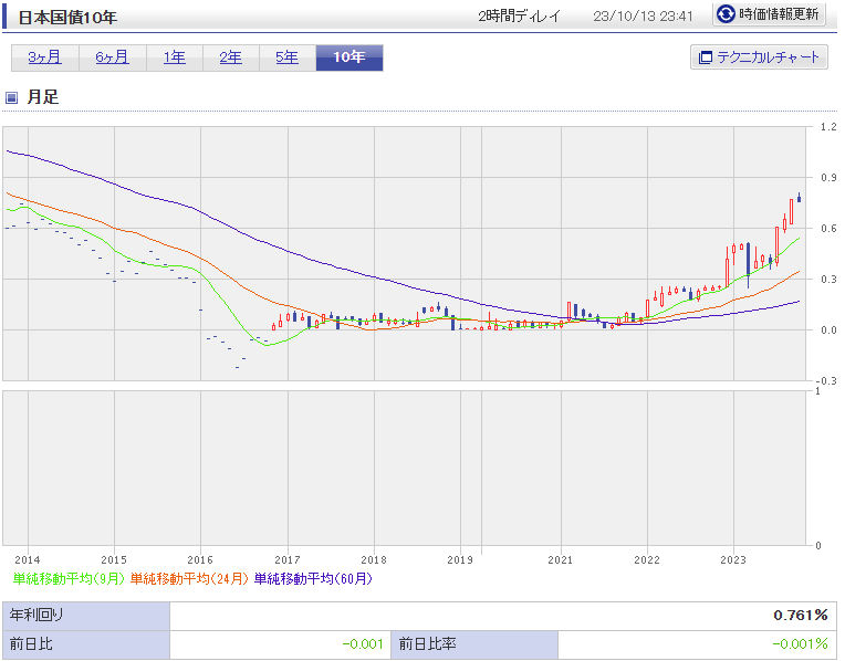 そして長期金利の代表的指標である国債の金利を見に行った際少しびっくりしました。10年物の新窓販国債の金利が0.8%、国債は長期債券の代表であると同時に元本保証の低リスク資産(ただし金利が前後するので市場取引での売却損はありえます)の代表選手でもあるのですが、その金利が1%が見えるレベルまで到達しているのです。流石に現状のインフレ率を下回り、高利回りとは程遠いのですがそれでも元本保証の金利商品で利子・利回りと呼べる水準の金利がついたというのは興味深いです。