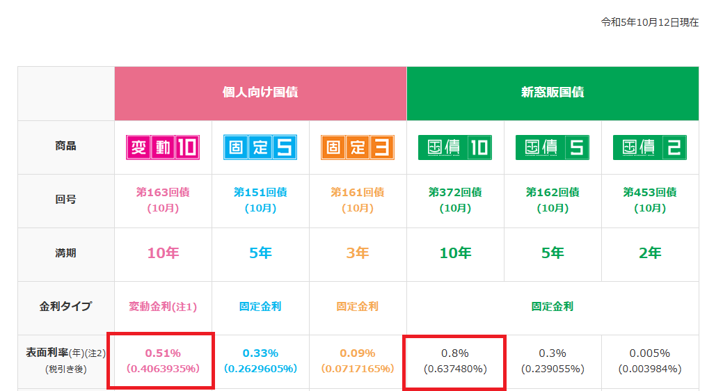 現在募集中の個人向け国債・新窓販国債@財務省2023年10月12日現在
