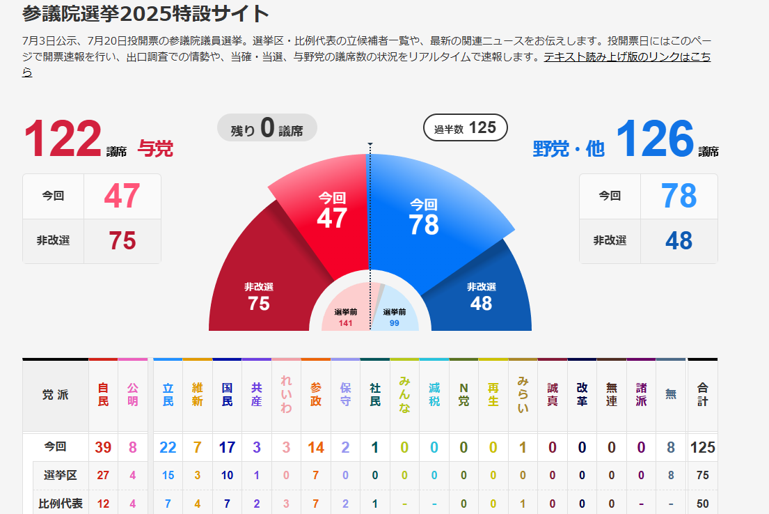 参議院選挙 自民・公明 過半数割れ【各党の獲得議席 全確定】@NHK2025/7/21より