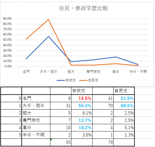参政党と自民党の学歴比較(名門は東大京大、旧帝一工、早慶、MARCH、関関同立)