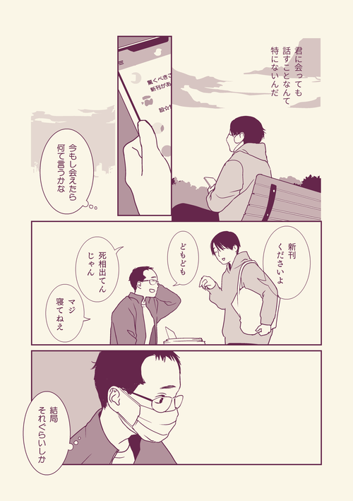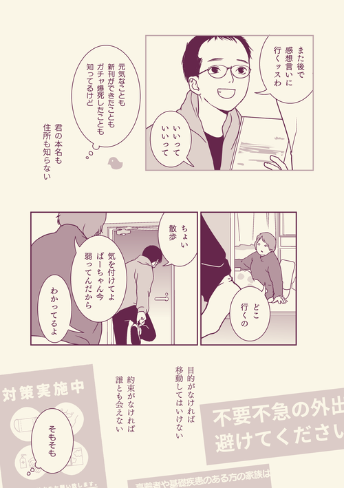 それから半年(?)後、色々あったけどどうにか開催が決まった11月のコミティア、カァ〜〜参加したかったわね〜とホゾ噛んでた前日に突然「今から短い漫画を描けば当日開催時間中にアップできるのでは?」と思い立って、徹夜で描いたのがこの4P漫画です。急いだのでタイトルがない。