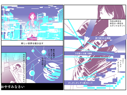 先にアルバムの曲を聴かせていただくというすごい経験をして(いいのか??)(その後予定通り購入)、そこから勝手に歌詞を書き起こしてそこからキーワードを拾ってネームを起こすという不思議な作り方をしました。楽しかったです。