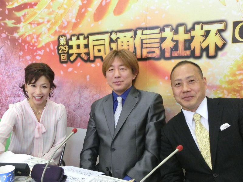 左はキャスターの工藤わこさん、中央が記者、右は元競輪選手で特別解説の野原哲也さん。