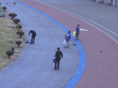 清掃作業が行われていた。紙吹雪の始末は大変そうで...。