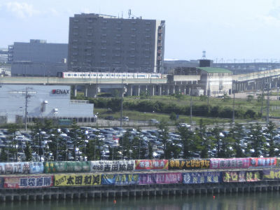 1Mの向こうにりんくう常滑駅が見えるボートレースとこなめ水面。