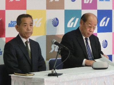 写真はグレード競走見直しの記者会見をする日本モーターボート競走会の皆川浩二会長(右)と宮本賢治常務理事(左)。本紙HPに記事が出ている。