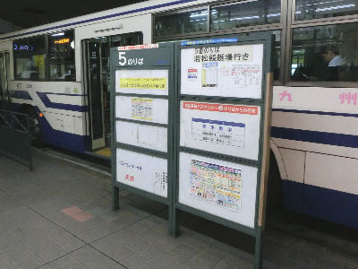 バスセンター5番のりばに「若松競艇場行き」とある。すでにバスが到着していたが...。