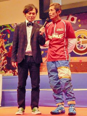 ホープくん(右、防府競輪のマスコットキャラクター)と記念撮影に応じる岩津裕介。