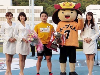 優勝カップと花束を手に笑顔の岩津裕介。
