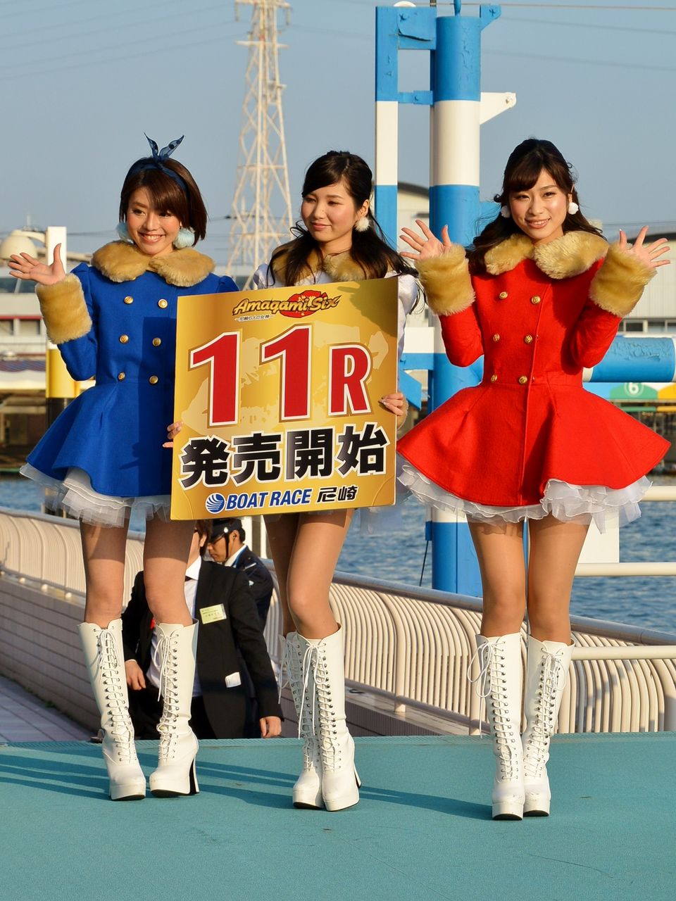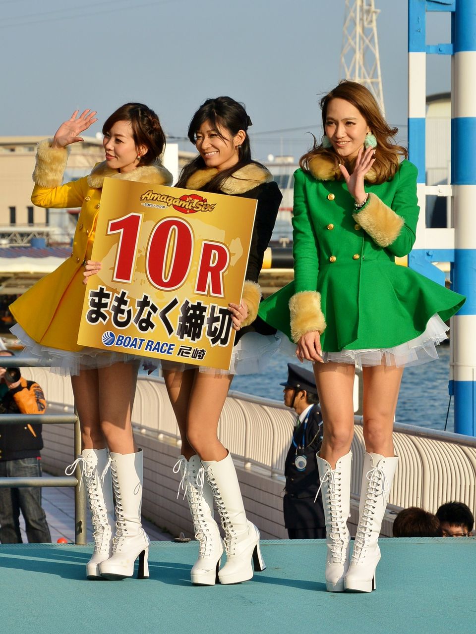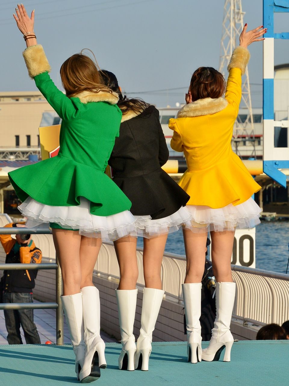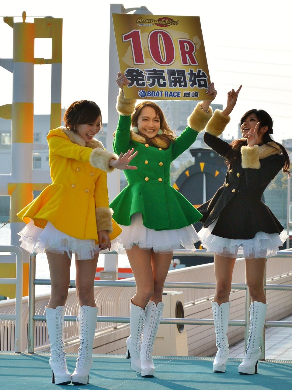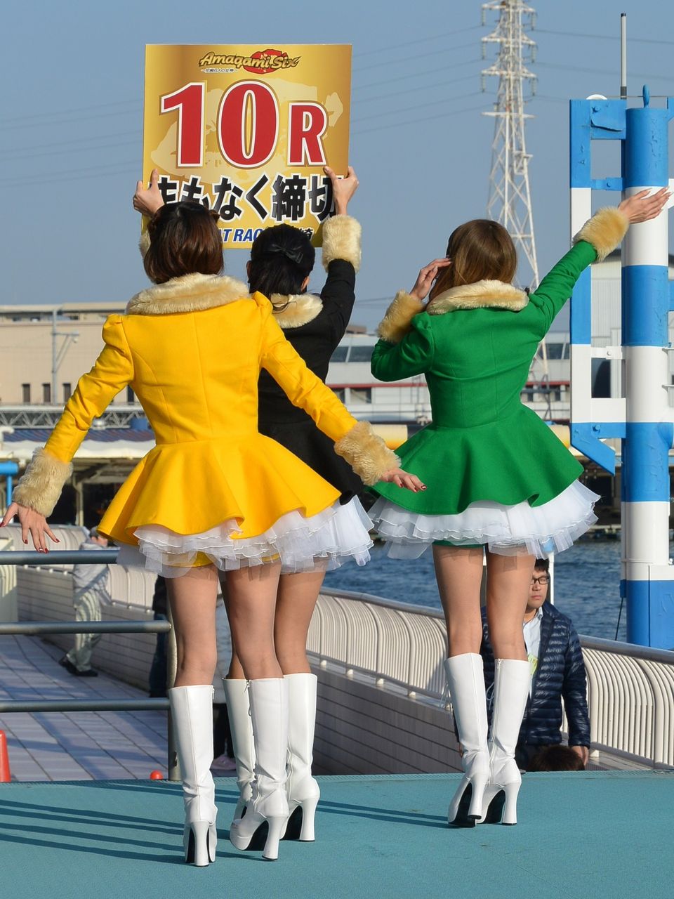 Vol.3の続き。「ミニライブ」のあとは「ラウンドガール」。ピット取材の合間に水面前ステージへ。まずは10R発売開始直後。あまがみブラック(史織)、イエロー(益田あゆみ)、グリーン(miwaco)が登場。