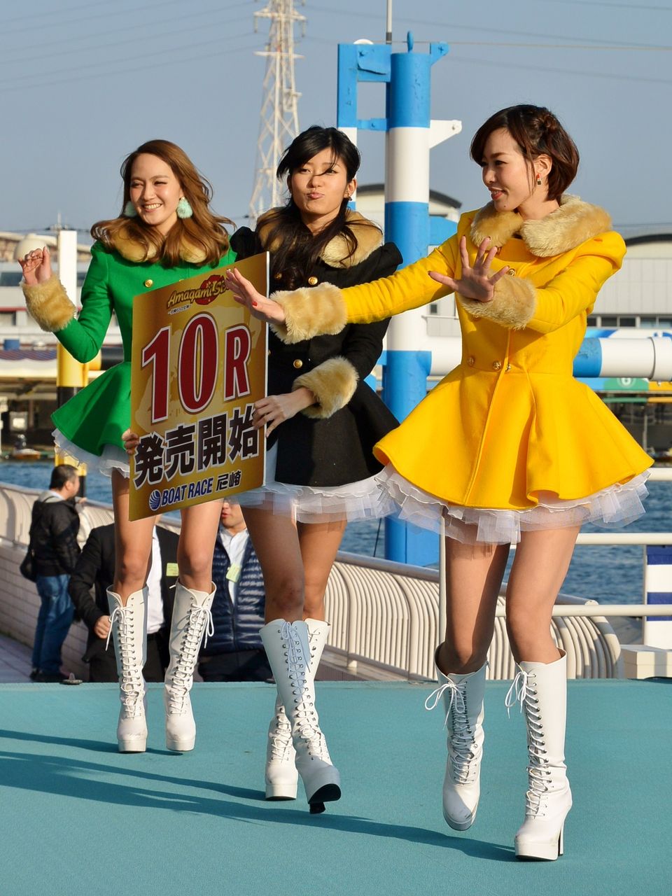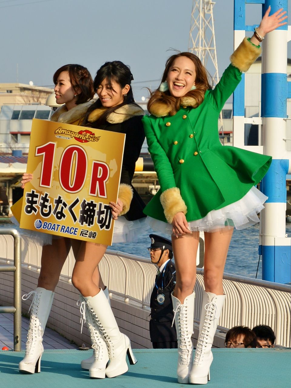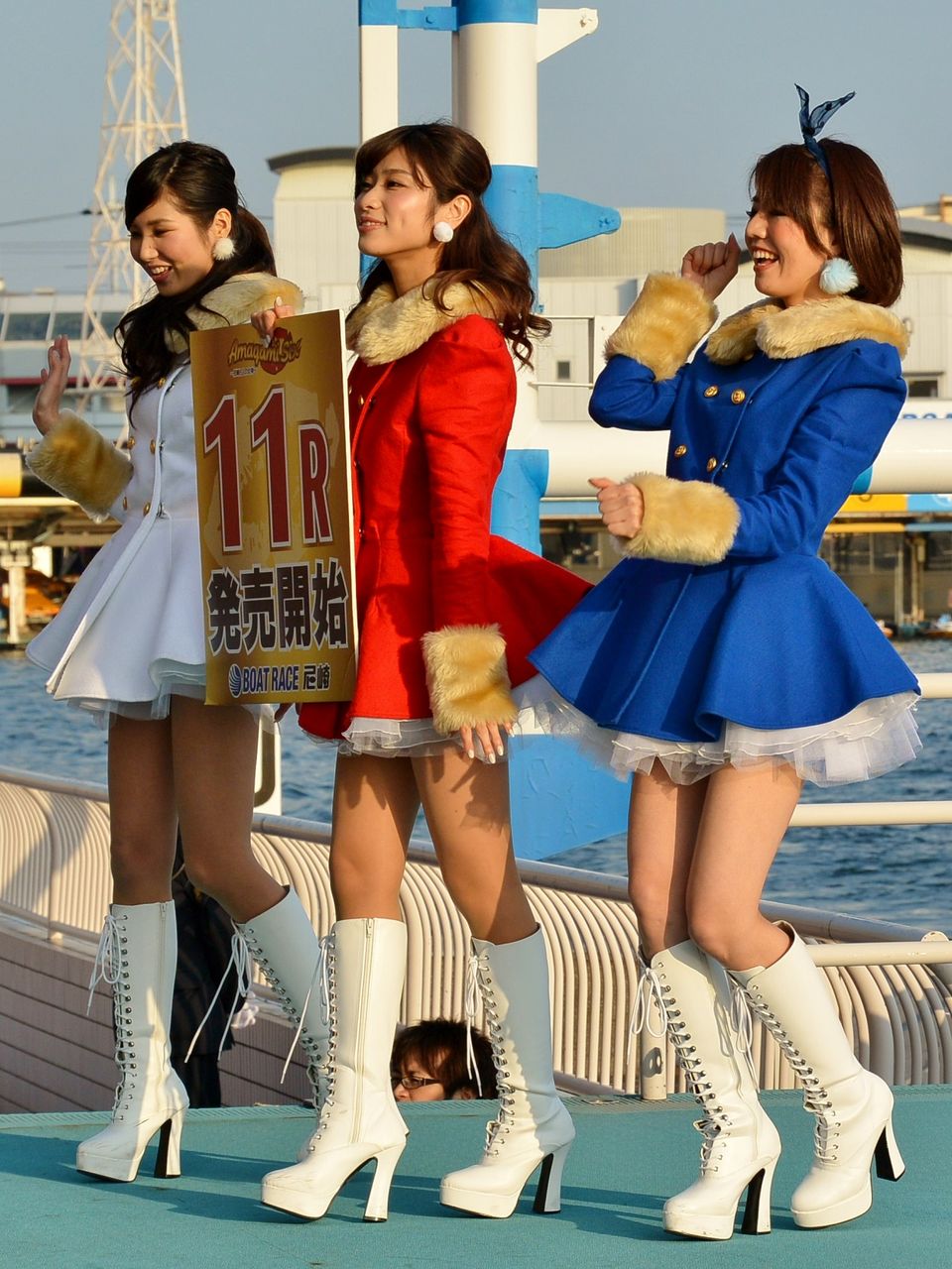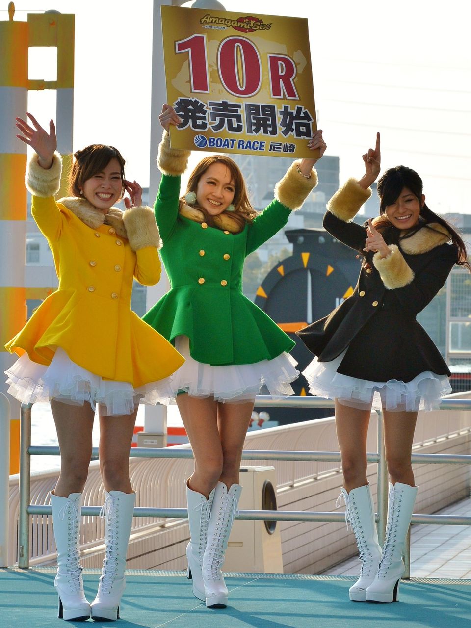 Vol.3の続き。「ミニライブ」のあとは「ラウンドガール」。ピット取材の合間に水面前ステージへ。まずは10R発売開始直後。あまがみブラック(史織)、イエロー(益田あゆみ)、グリーン(miwaco)が登場。