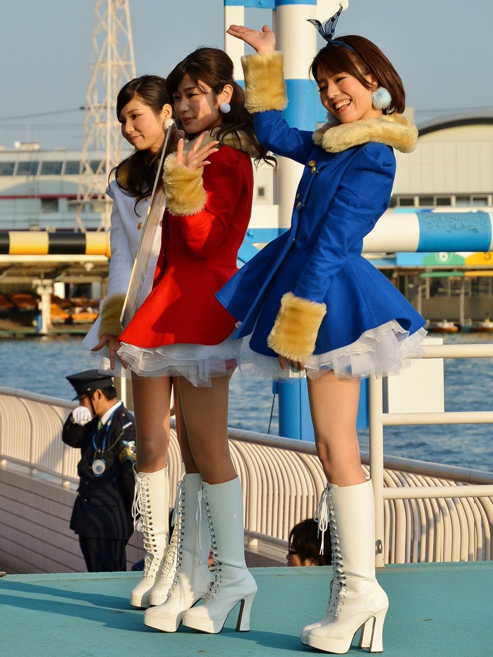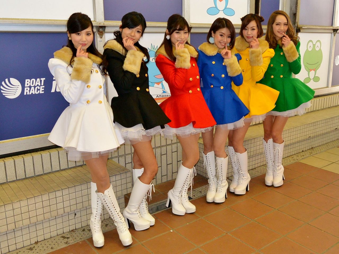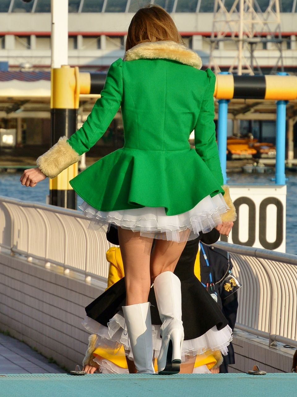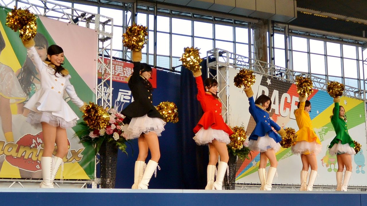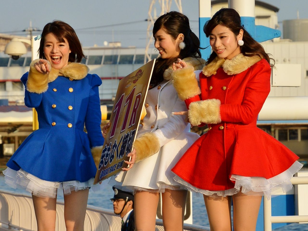 Vol.3の続き。「ミニライブ」のあとは「ラウンドガール」。ピット取材の合間に水面前ステージへ。まずは10R発売開始直後。あまがみブラック(史織)、イエロー(益田あゆみ)、グリーン(miwaco)が登場。
