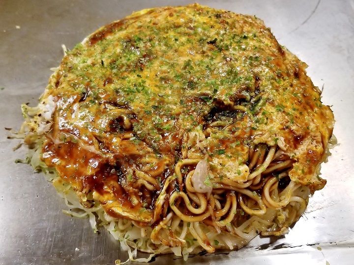お好み焼き(スペシャルそば。野菜、肉たっぷり、玉子、そば)。満腹&ホロ酔いで店を後にした。