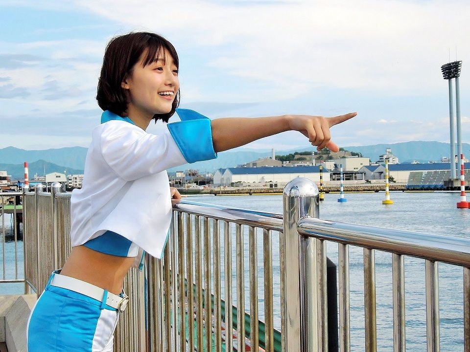 ブルーナイターエンジェル7期サポートメンバーのTOMOKAだ。バレエ歴10年、新体操歴5年(小学生時に全国大会に出場)、器械体操歴3年。高校生時代は副生徒会長に選ばれた。「女性が憧れる女性になりたいです。京極賞は地元選手に頑張ってもらいたいですが、特に片岡雅裕選手を応援しています」。今回の京極賞ではラウンド&チェッカーガール、イベントなどで活動予定。