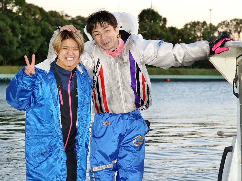 レディースチャレンジカップを制した遠藤エミ(左)とレスキューボートに乗る辻栄蔵(右)。