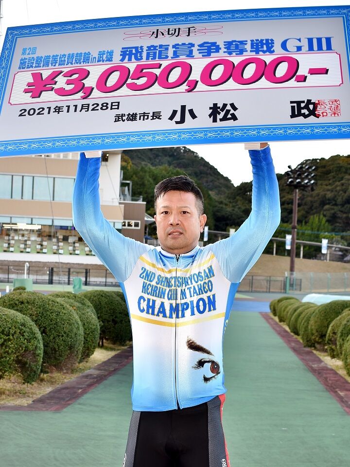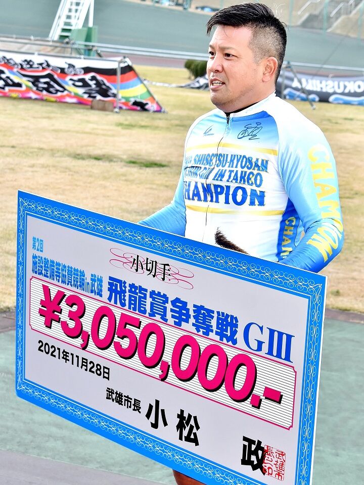 武雄競輪「G3・施設整備等協賛競輪・飛龍賞」はきょう(28日)、12Rで決勝戦が行われ、(1)荒井崇博(43)=佐賀・82期・S1=が最終バック6番手からまくって1着。2019年4月の武雄記念以来、通算16回目、地元で5回目となるG3優勝を飾り、賞金305万円を手にした。番手まくりを敢行した(4)松岡辰泰(熊本)が2着に入り、荒井を追走した(6)五十嵐力(神奈川)は3着だった(本紙HPに記事あり)。