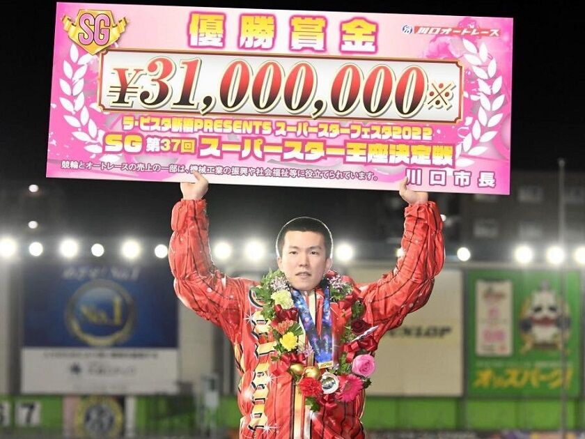 川口オート「SG・第36回スーパースター王座決定戦」はきょう(31日)、12Rで優勝戦が行われ、3枠の鈴木圭一郎(28)=浜松・32期=がコンマ02のトップスタートから逃げ切り、6年ぶり2回目のSS王座制覇。賞金3100万円を獲得した。SG優勝は12回目。2022年の優勝は9回。通算63回目。4年ぶり4回目の賞金王に輝いた。4連覇を目指した青山周平(伊勢崎)は出遅れて4着に敗れ、2着に有吉辰也(飯塚)、3着に松尾啓史(山陽)が入った。また、11Rで争われた「スーパースターシリーズ優勝戦」は黒川京介(24)=川口・44期=がSSシリーズ初優勝。佐藤摩弥(川口)は2着に敗れた(本紙HPに記事あり)。