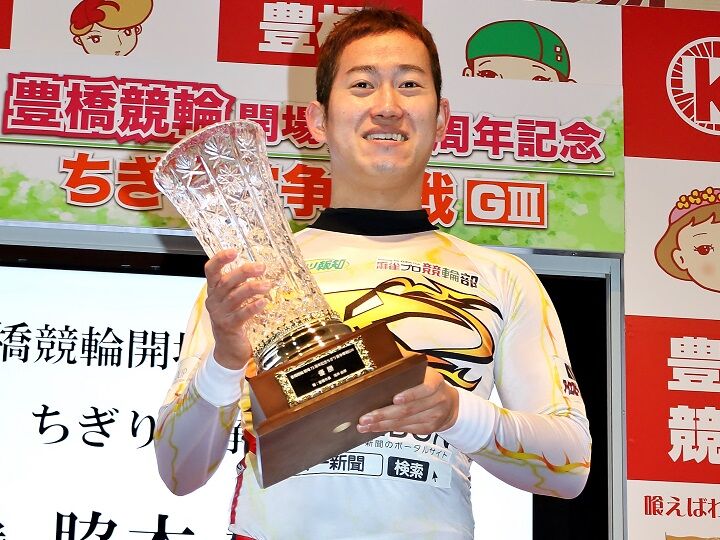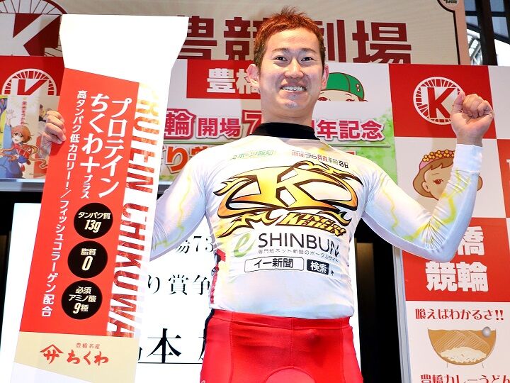昨年のKEIRINグランプリ覇者は、豊橋でも圧巻の強さを見せた。決勝戦はスタートでけん制が入り、誰も前に出ようとしない。しびれを切らした古性が出て、脇本は誘導員の真後ろで周回を重ねる。残り2周の赤板を迎えても後方からの動きはなく、8番手の(3)山口拳矢(岐阜)が内を上昇したが、(2)池田憲昭(香川)をさばいて7番手に入れただけ。誘導員退避後、最終ホーム手前からペースを上げた脇本が、別線の仕掛けを最後まで許すことなく、きっちりと押し切った。
