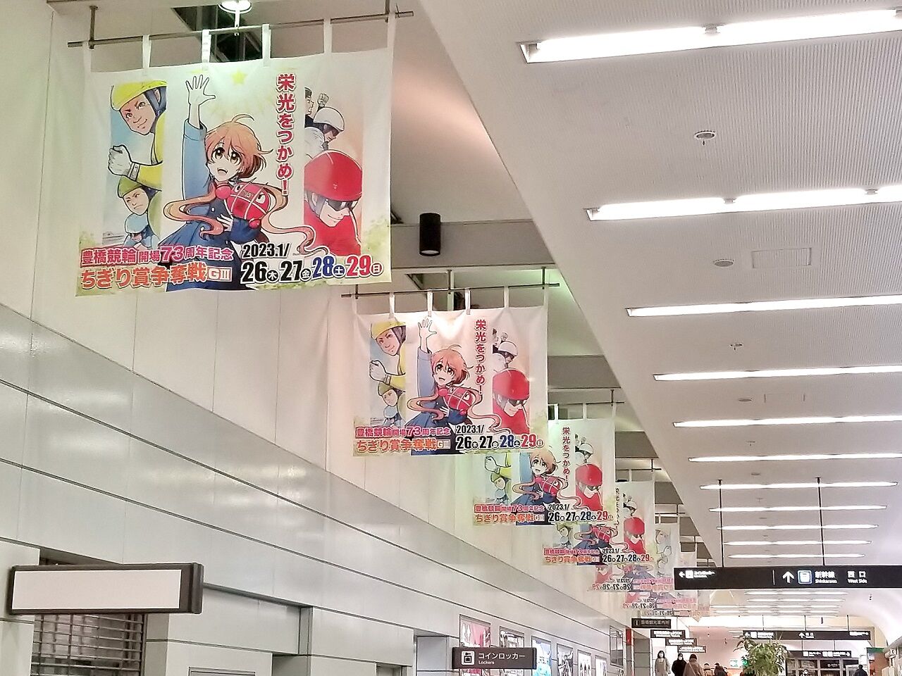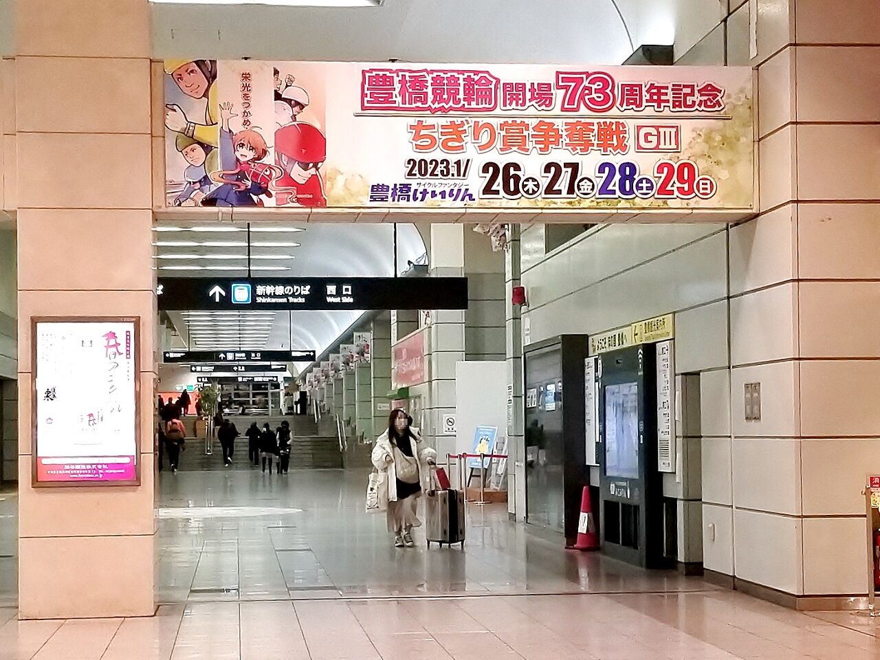 JR豊橋駅内は豊橋競輪の告知がたくさんあった(前日撮影)。3日目のメインは「準決」。10Rは(2)山口拳矢(岐阜)、11Rは(2)古性優作(大阪)、12Rは(1)脇本雄太(福井)が1着だった。あす(29日)最終日は12R「決勝」がメイン。出場選手は次の通り。