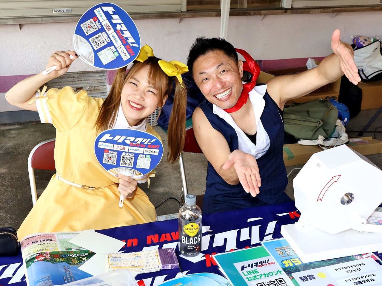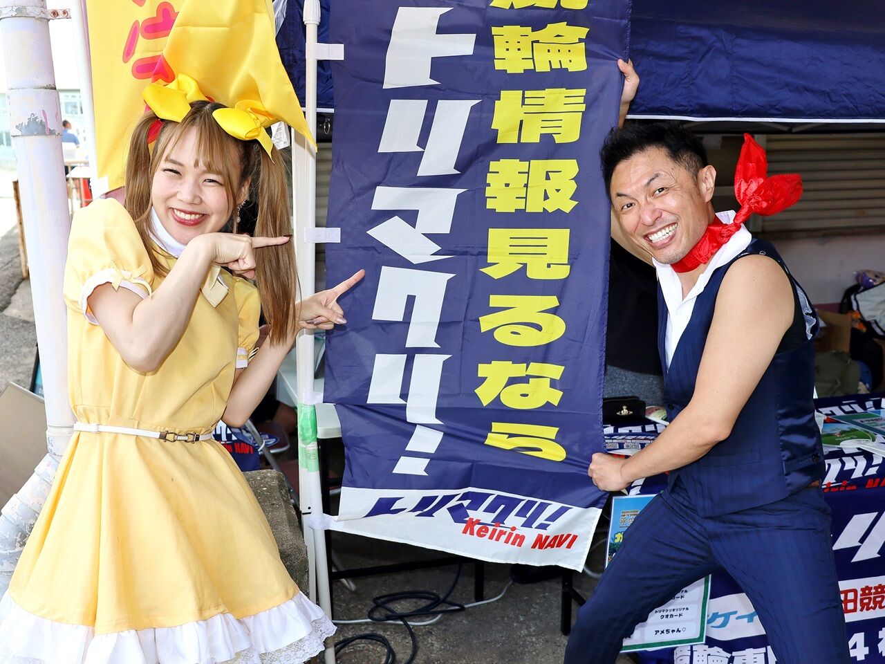 「G3・向日町競輪開設75周年記念・平安賞in奈良」(京都府営)開催中の奈良競輪では、きょう(27日)から場内にトリマクリブースを設置。競輪専門紙4紙が合同で営むサイトを紹介している。そのPRを買って出ているのがお笑いコンビのココナッツ学園(かとうにちようび!、ランディー)。初心者からマニアまで老若男女を問わずやってくる競輪マニアの応対をしている(本紙HPに記事あり)。