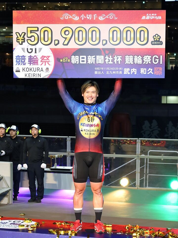 小倉競輪「G1・第67回競輪祭」はきょう(24日)、12Rで決勝戦が行われ、(6)阿部拓真(35)=宮城・107期・S1=が(5)吉田拓矢(茨城)マークから最終3角過ぎで切り替え、直線で伸びて1着。G1初決勝で優勝を飾り、賞金5090万円(副賞含む)とKEIRINグランプリ2025(12月30日・平塚)出場権を手に入れた。2、3着は(2)荒井崇博(長崎)、(3)松井宏佑(神奈川)の順で入り、3連単は最低504番人気の35万990円と大波乱の結果だった(本紙HPに記事あり)。