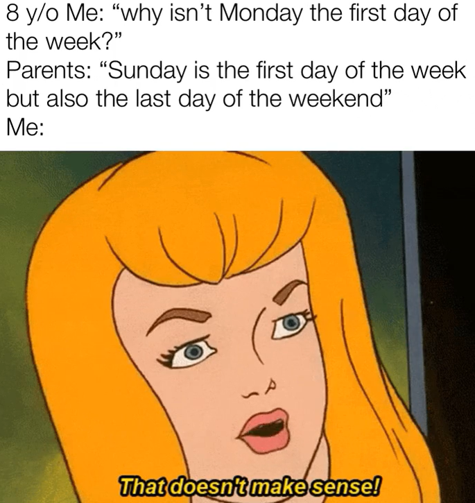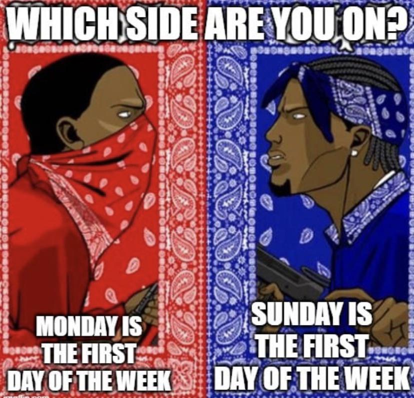 この議論は非アメリカ人が数週間前に質問したことから勃発したけど、一週間の数え方は日曜日から始まるけど、九時五時の労働は月曜日から始まるって僕は説明した。