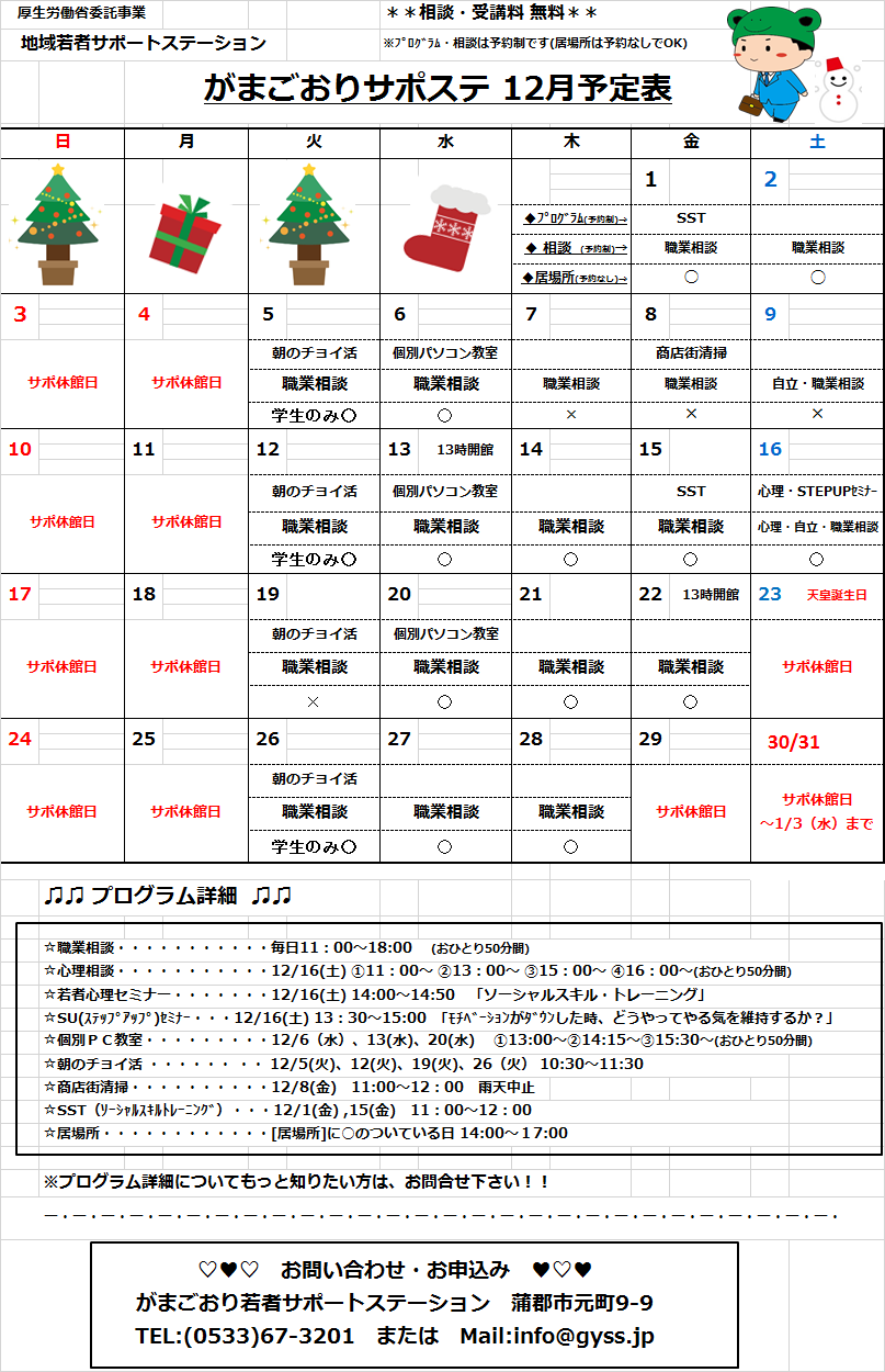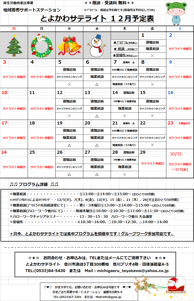 12月のサポ・サテライトのスケジュールができましたので、ご確認ください。