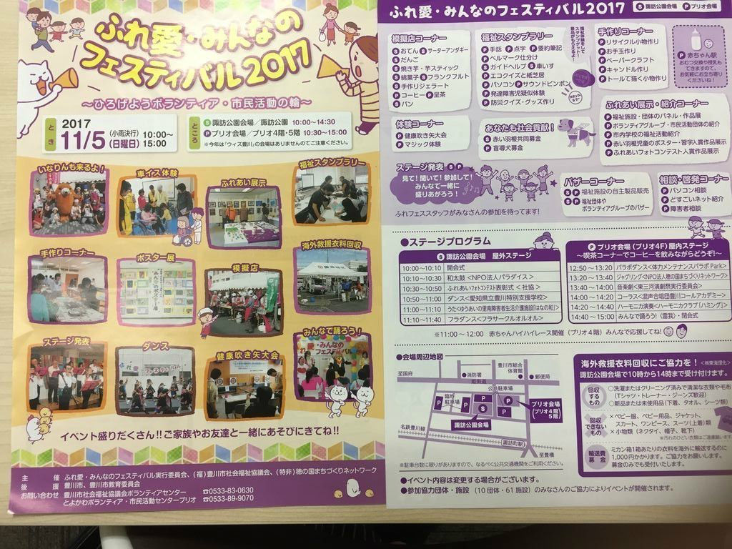 11/5(日)10:00〜15:00 場所はプリオ4・5階とお隣の諏訪公園にて『ふれ愛・みんなのフェスティバル2017』が開催されます。ちなみに協力団体・施設は10団体・61施設のみなさんが参加されます。