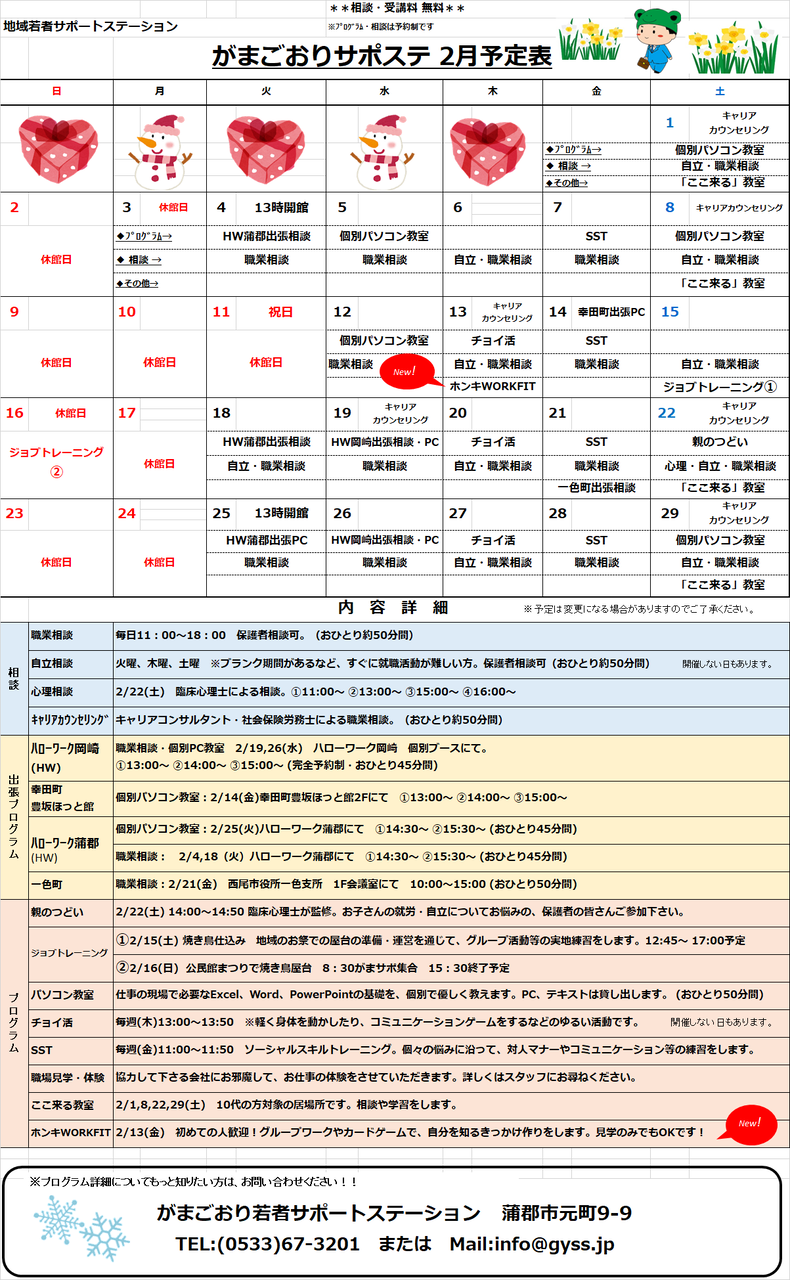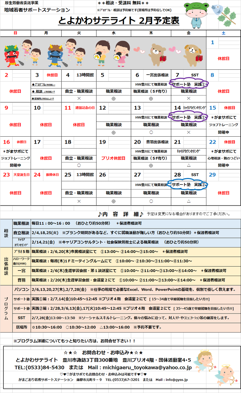 さて、2月のがまごおりサポステ、とよかわサテライトのスケジュールができましたので、ご確認ください