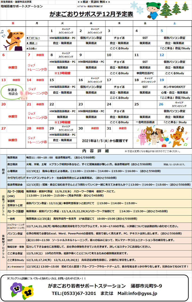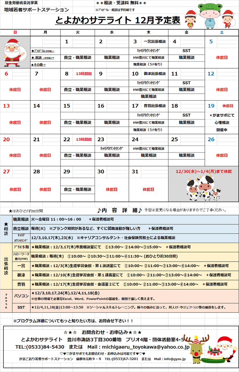 さて、12月のがまごおりサポステ、とよかわサテライトのスケジュールができましたので、ご確認ください