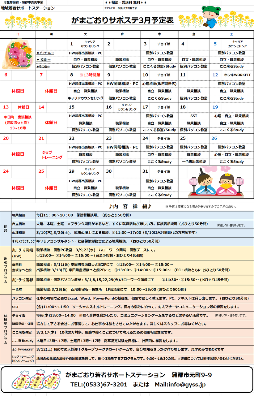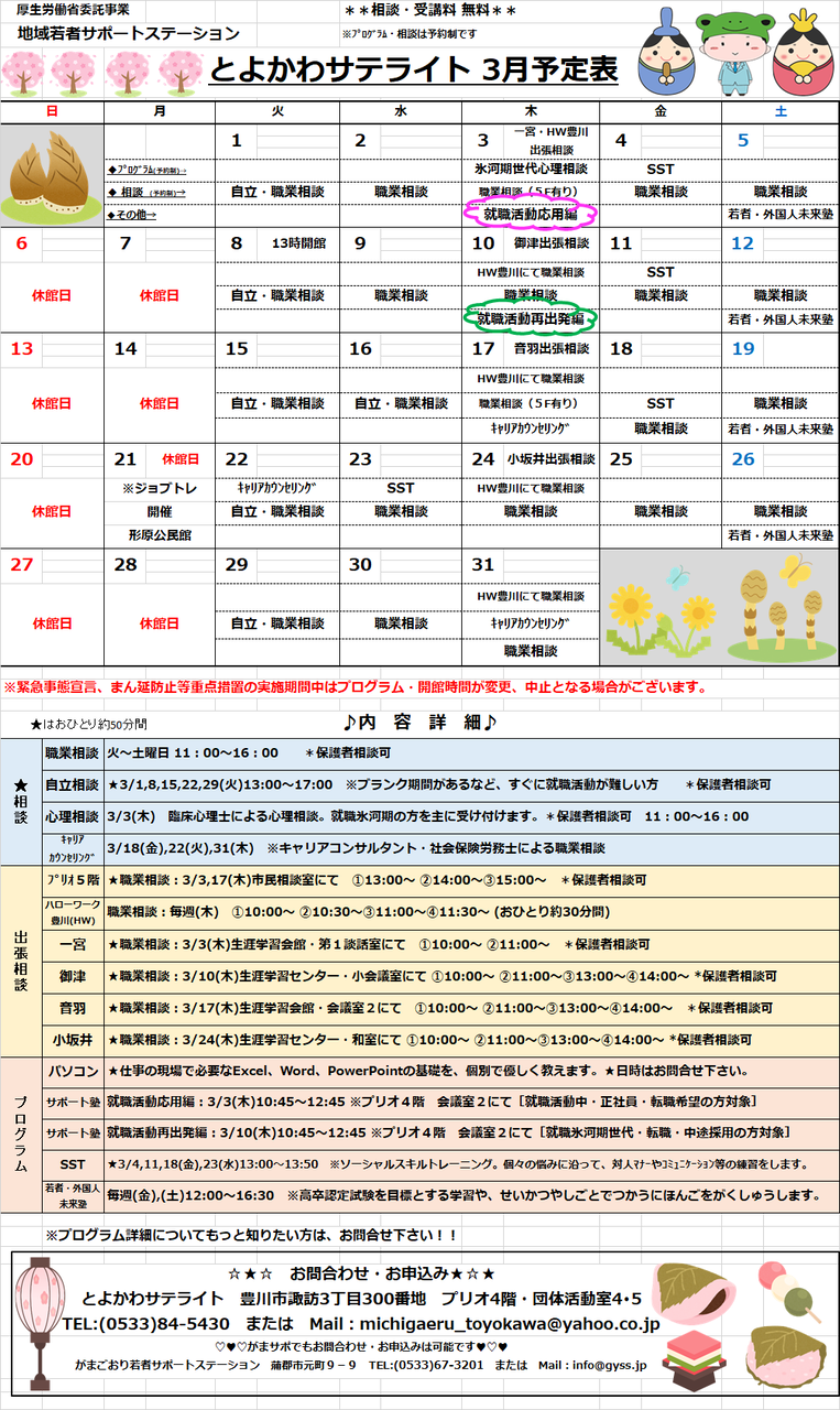 さて、3月のがまごおりサポステ、とよかわサテライトのスケジュールができましたのでご確認ください