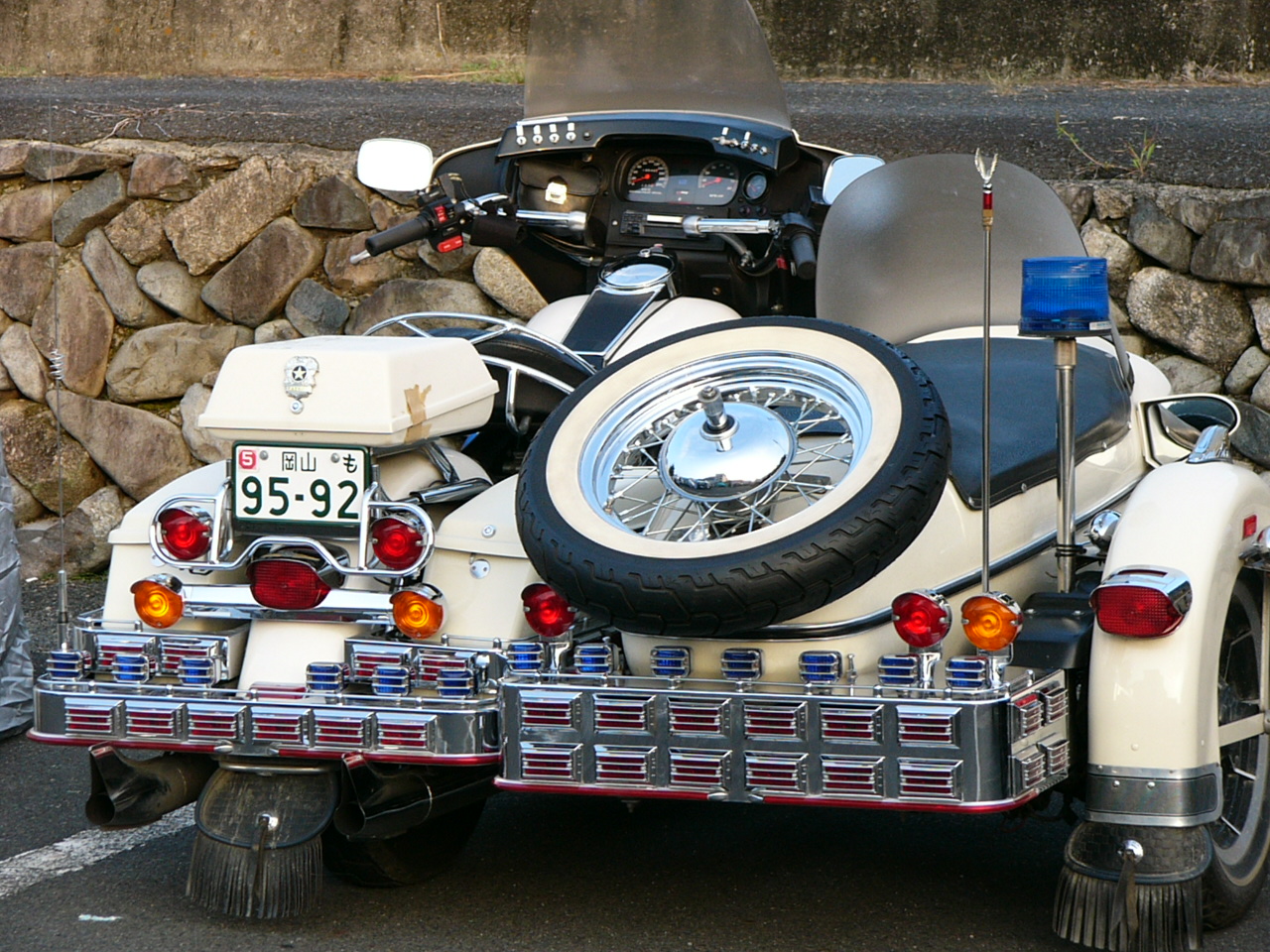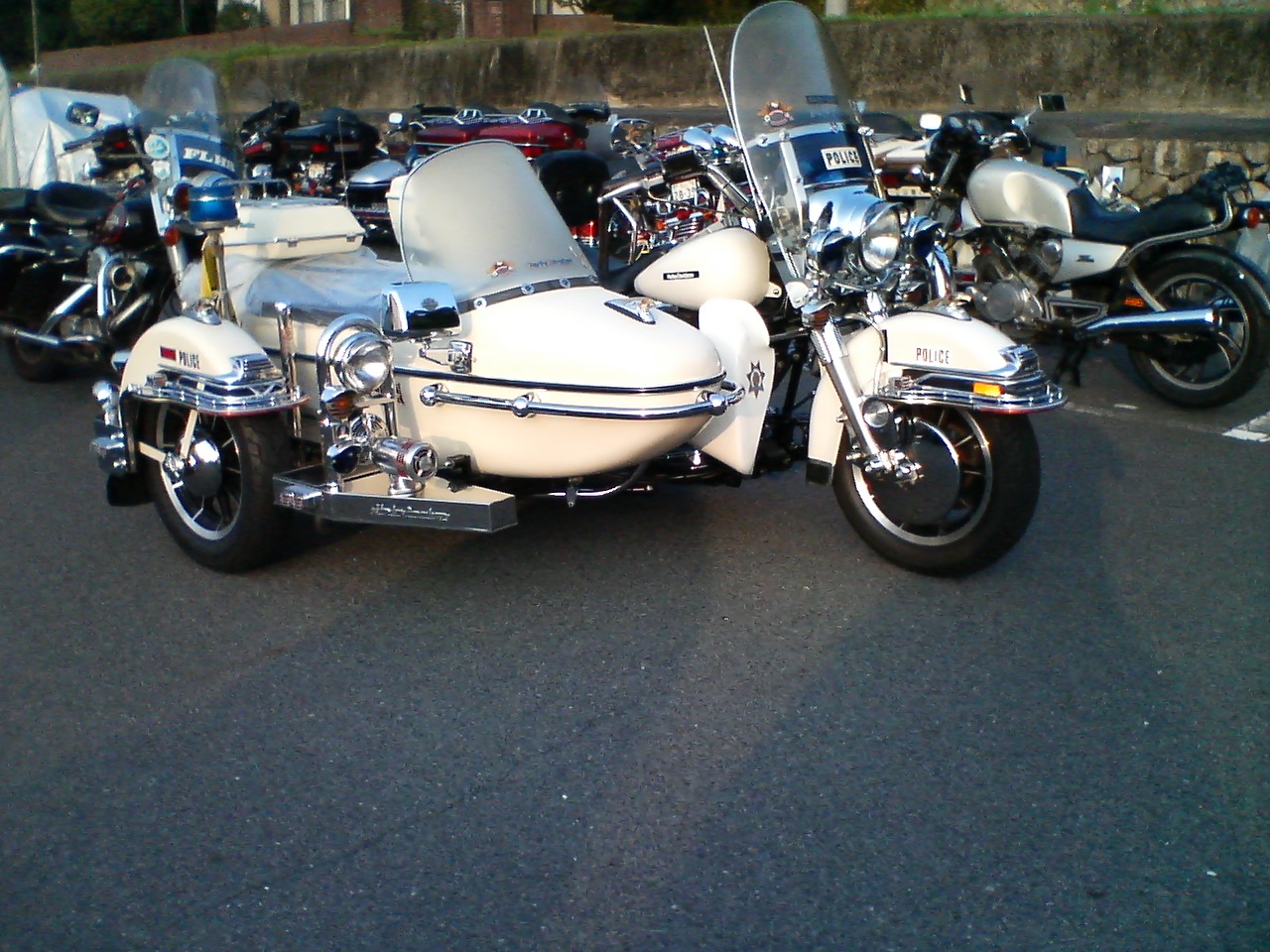 ハーレーホワイトポリスサイドカー。なかなか かっこいい特にスペアタイヤは良いですね。