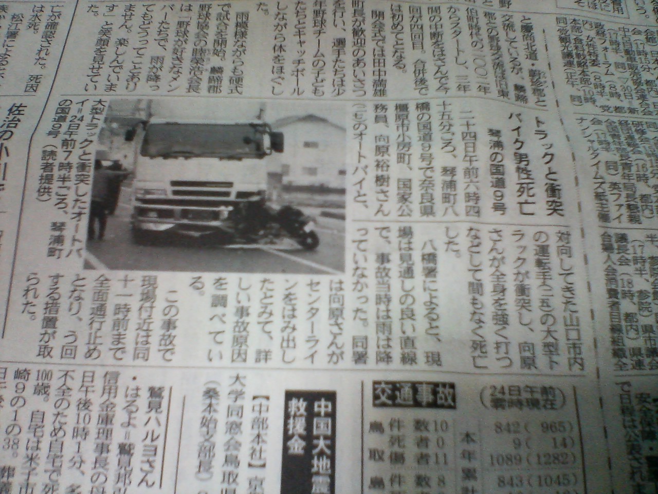 643c746f.jpg鳥取県東伯郡琴浦町の国道9号線で奈良県の青年が運転するバイクと大型トラックが衝突し 死亡事故がありました こんな悲しい事故はない様にライダーの皆様くれぐれも安全運転でツーリングをしてください、お願いいたします。